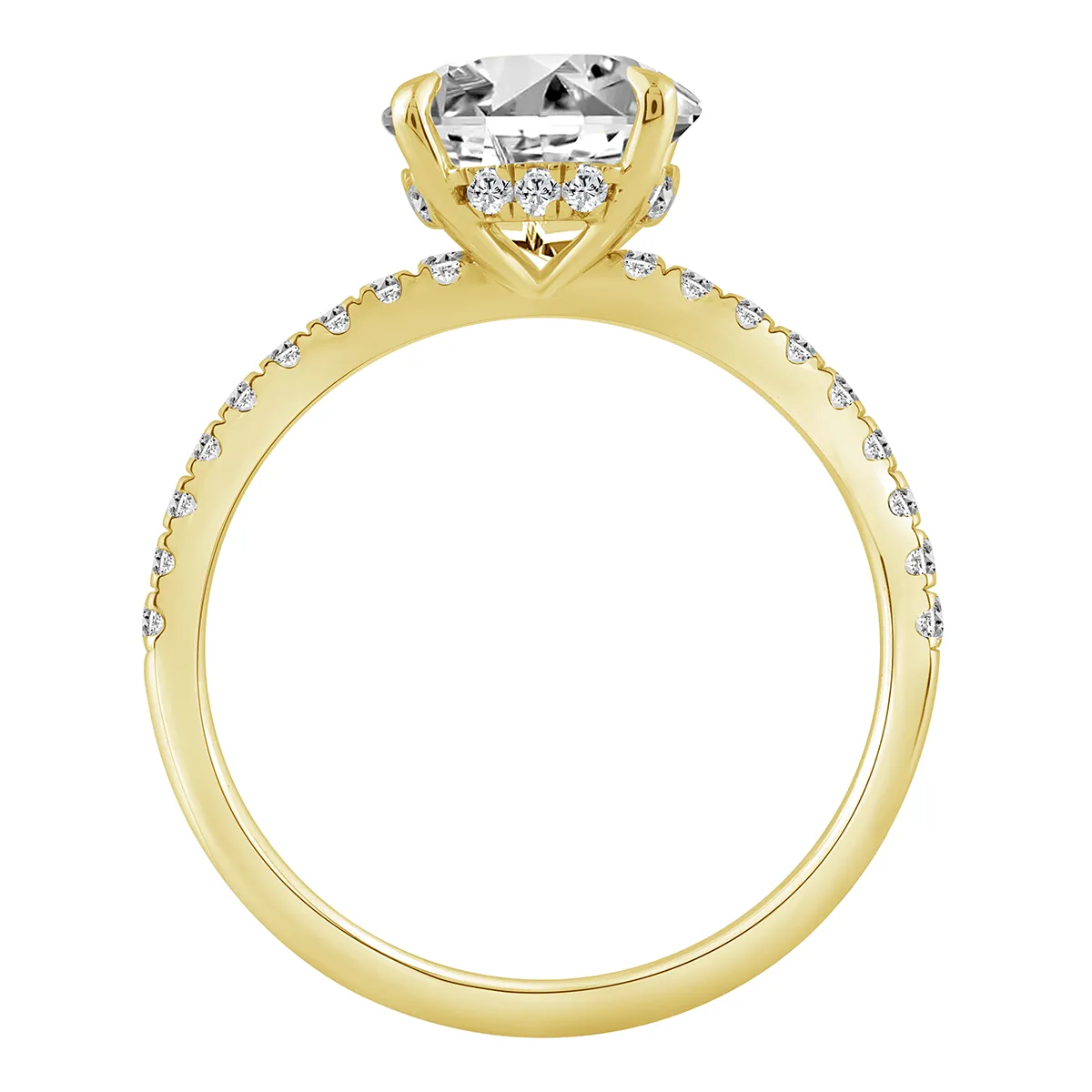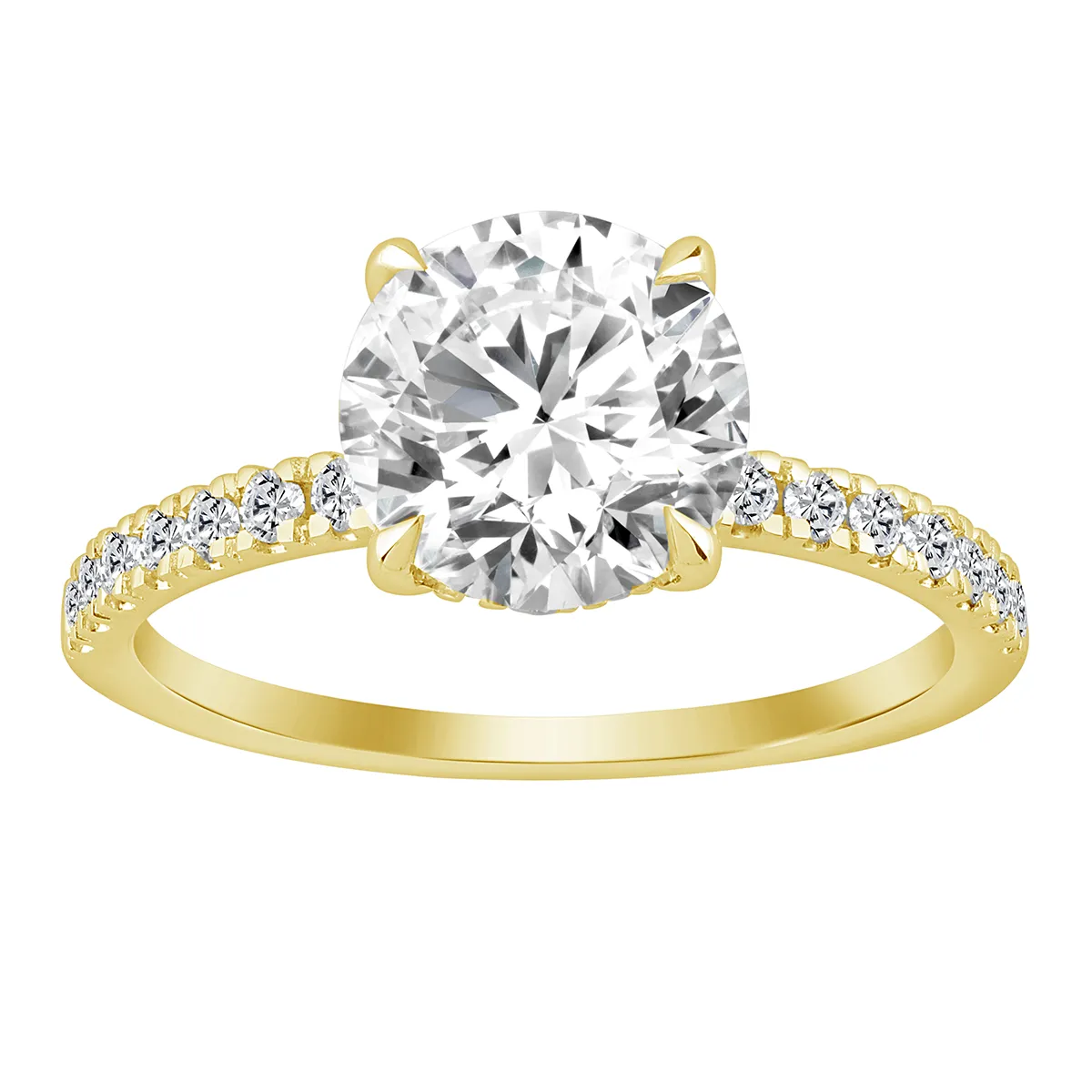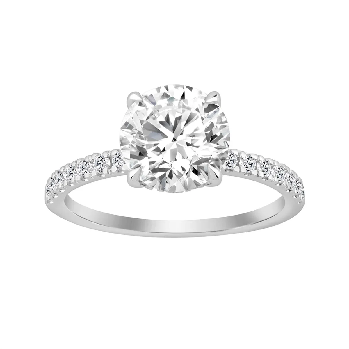 Anillo de compromiso con diamantes central de laboratorio, talla brillante con corona de brillantes y brillantes en los laterales, realizado con oro de 18K.